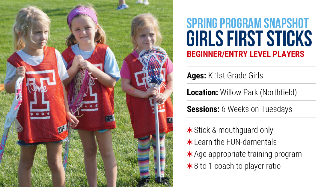 Girls First Sticks is an entry level program based around a girl specific curriculum intended to teach players the fundamentals of girl's lacrosse while allowing them to play alongside other lacrosse players in a fun and safe environment!